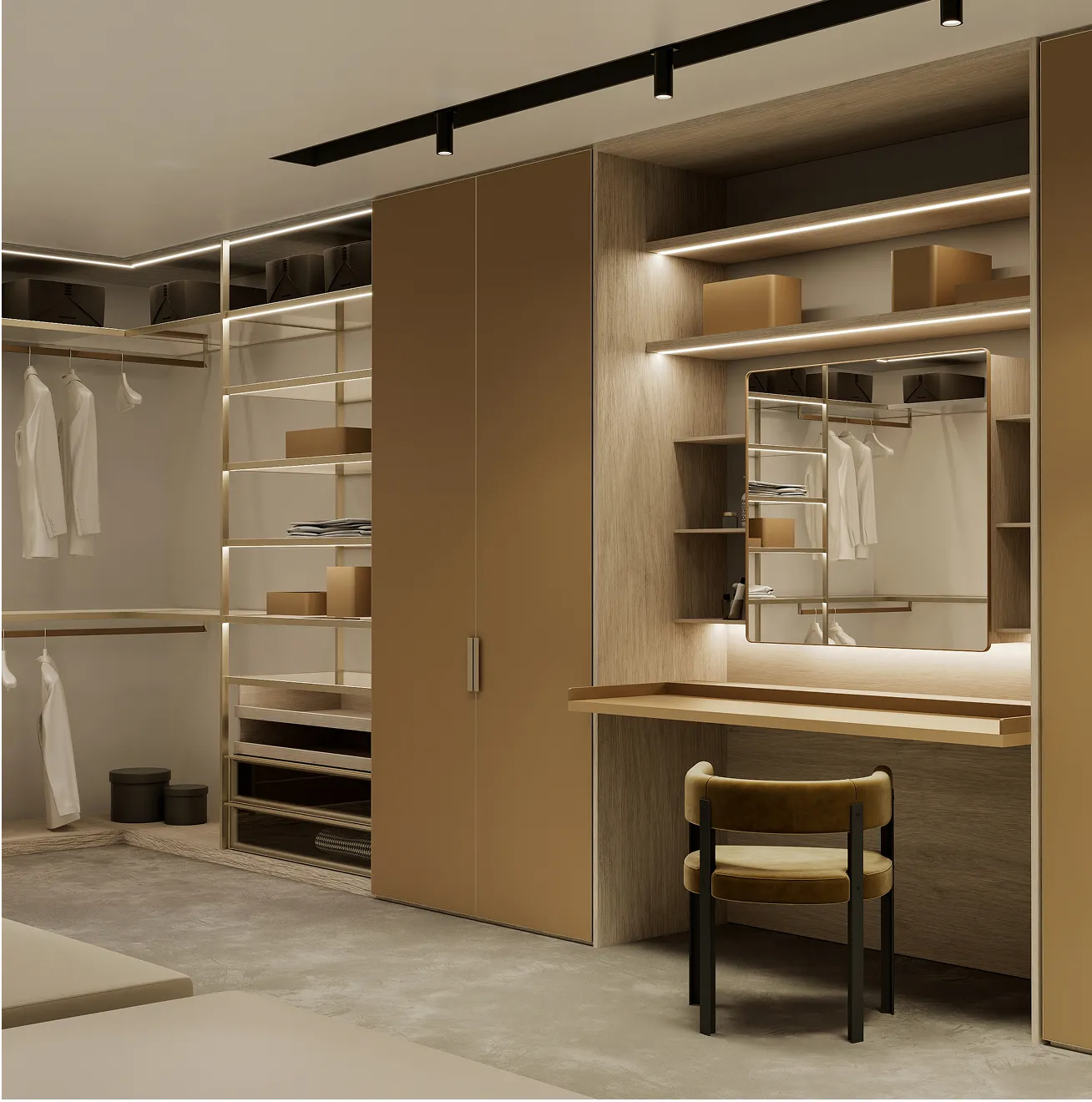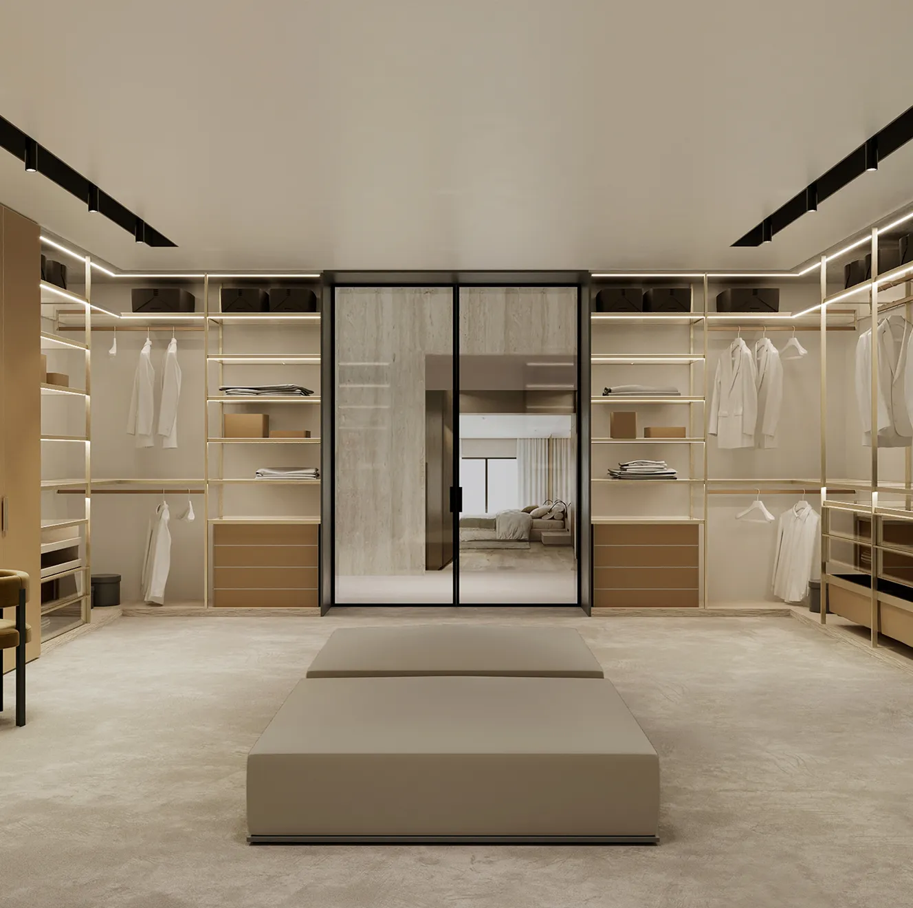 A curated walk-in system defined by modular architecture and refined craftsmanship. Each component is tailored to the exact dimensions of your space, offering infinite possibilities in layout, accessories, and material combinations.