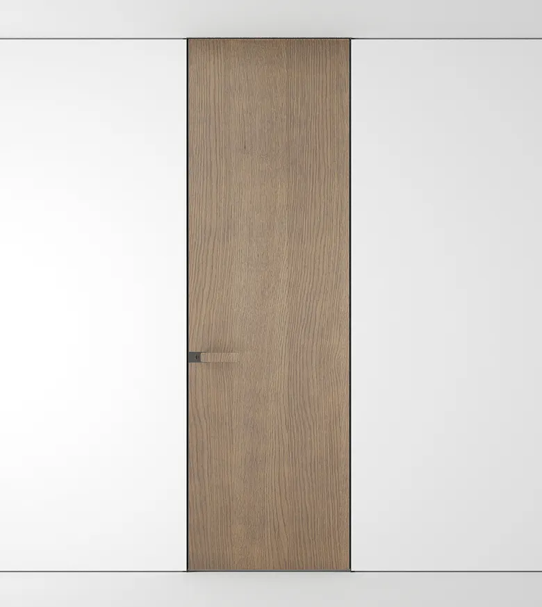Ray concealed doors are designed to integrate flawlessly with wall panels, stone cladding, custom joinery, built-ins, or custom wardrobes, creating uninterrupted surfaces that enhance the flow of the entire interior. This coordination ensures that the door becomes virtually invisible, allowing the architectural elements to merge, preserving the purity and cohesion of the space.