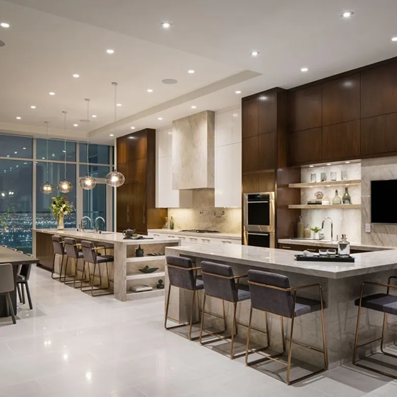 Penthouses allow open-plan layouts with panoramic views and expansive terraces. Island or U-shaped kitchens optimize preparation zones, incorporate statement materials, and integrate seating for dining or social interaction, reflecting luxury living.