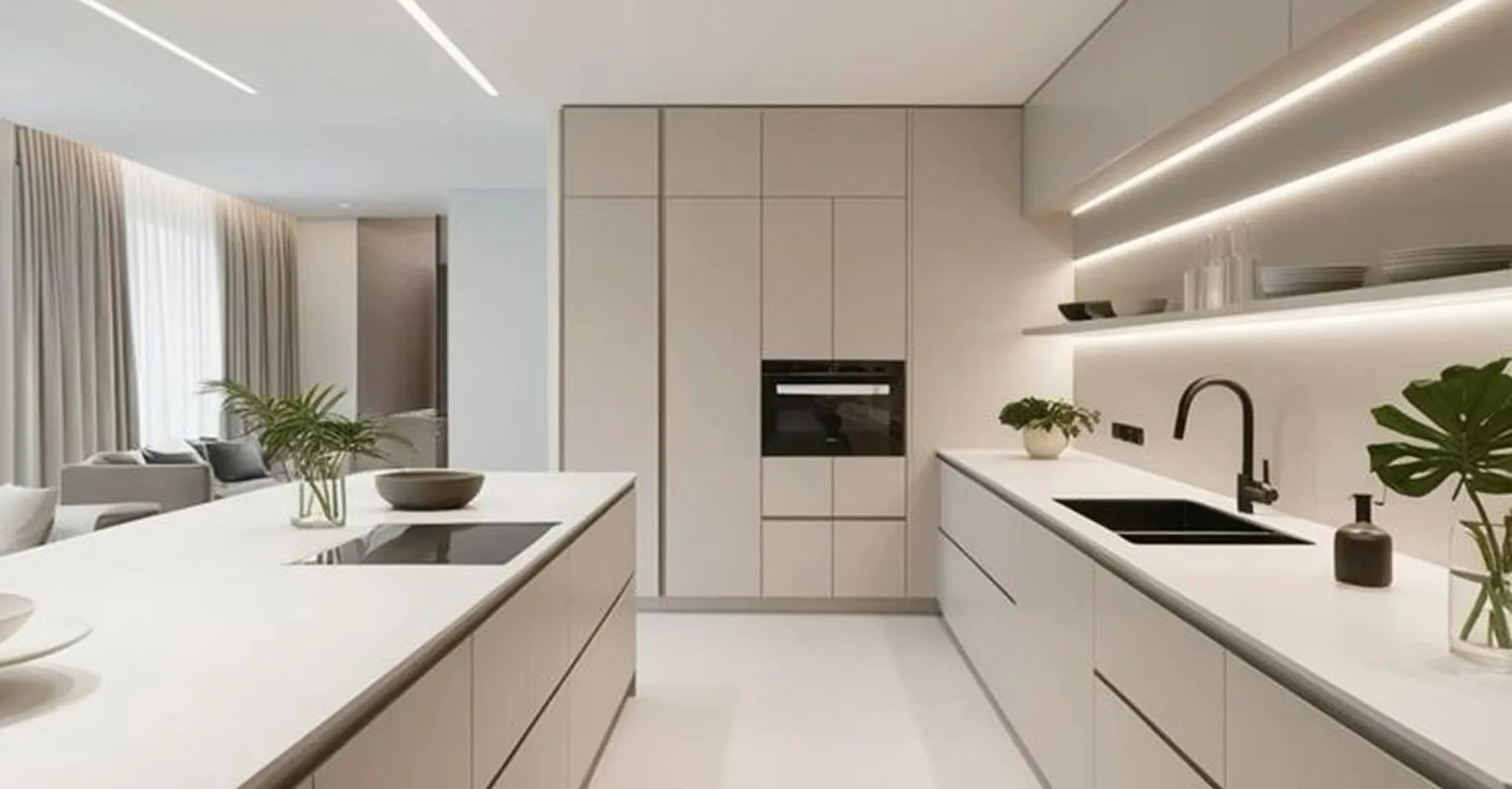 L-shaped layouts define corner spaces with precision, creating open zones for preparation and movement. Counters feature integrated lighting and quartz or sintered stone surfaces suited to Dubai’s climate. Cabinetry with vertical storage and concealed compartments supports organized, high-end living, perfect for modular kitchen setups.