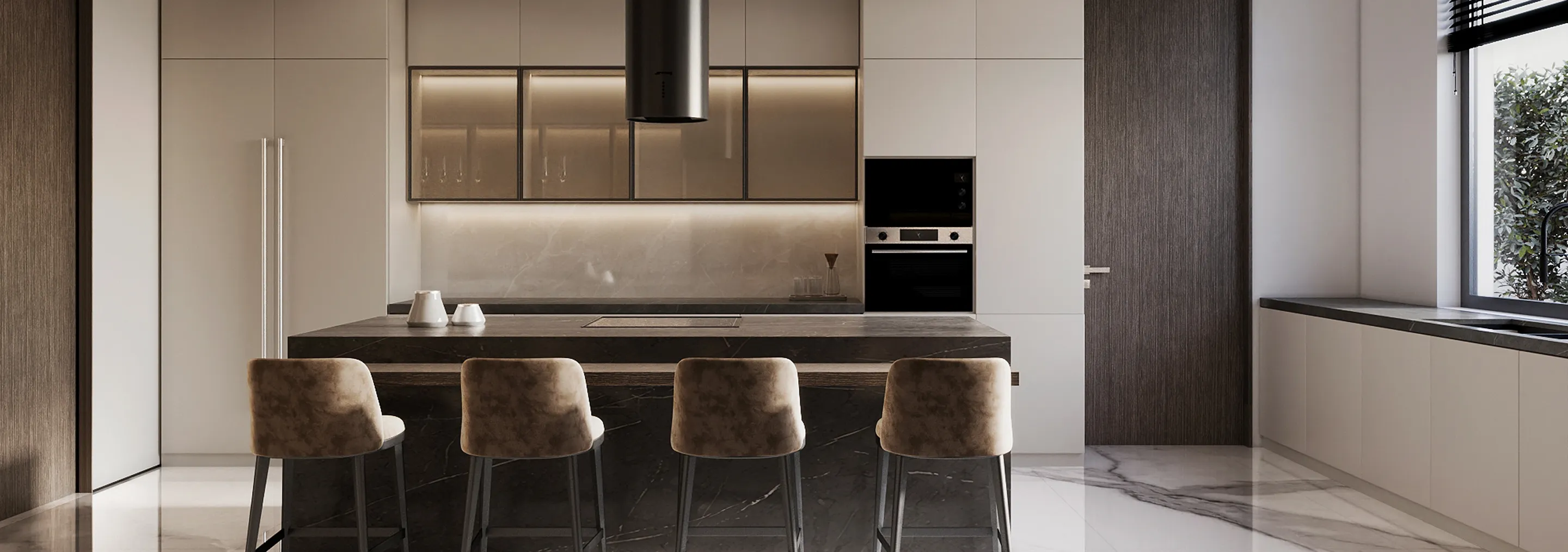 while a small one may limit prep space, storage, or seating. A well-proportioned island keeps the kitchen functional, making it easier to cook, entertain, and socialize. Storage is integrated into the island through deep drawers for pots and pans, pull-out spice racks, concealed compartments, and open shelves. Cabinets beneath the countertop store appliances, utensils, or pantry items, keeping surfaces uncluttered. A well-designed island creates a visual anchor, highlighting premium surfaces such as quartz, sintered stone, or engineered wood, and introducing statement features like sculpted countertops or textured cabinetry. This establishes the kitchen’s appeal and contributes to a sense of luxury. Incorporating smart features adds significant benefits: built-in cooktops and prep sinks streamline cooking processes, wine coolers and compact dishwashers improve convenience, and integrated charging stations keep devices accessible. These features reduce clutter, save time, and make the kitchen more responsive to daily routines and modern lifestyles. Rayfitout designs each island with functionality, ergonomics, and visual appeal in mind. Ergonomics involves countertop heights suited to cooking and dining, clear circulation for movement, and easy access to storage and appliances without bending or reaching. Layouts and heights are planned for comfortable use, and high-performance materials suited to Dubai’s climate are crafted with statement features like sculpted countertops, textured cabinetry, and metallic accents. Islands can double as a casual dining or breakfast area with stools or a cantilevered bar, creating an inviting corner for morning routines or relaxed gatherings.