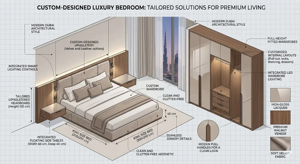 This includes bed frames, wardrobes, and bedside tables. Customized furniture allows complete control over materials, surfaces, and sizes. It produces a clean, fitted appearance that marks a real luxury bedroom interior.