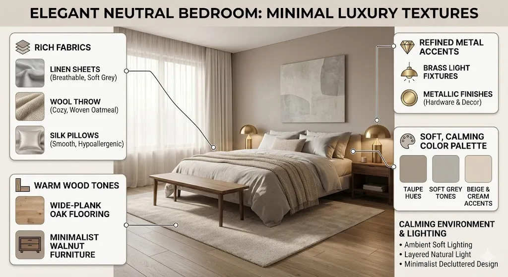 Colors such as beige, taupe, off-white, and soft grey tones create a background that can fit any room. Additionally, combining fabrics, wood, and light metal touches builds the interest. The result stays polished and clean without getting complicated.