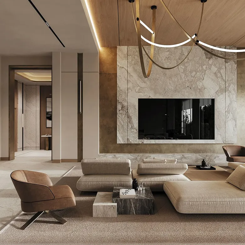 - Materials, Finishes & Textures: Luxury interior design includes thoughtful selection of materials, finishes, and textures to define the character and functionality of a space. Surfaces are chosen for durability, comfort, and visual appeal, including natural stones, engineered woods, metals, and high-quality fabrics. Finishes are made to reflect the property owner's intent, complement lighting, and maintain long-term value. Our material selection process for premium marbles and stones used in luxury interiors is outlined in our blog on how we select the world’s best marbles and stones for Dubai residences.