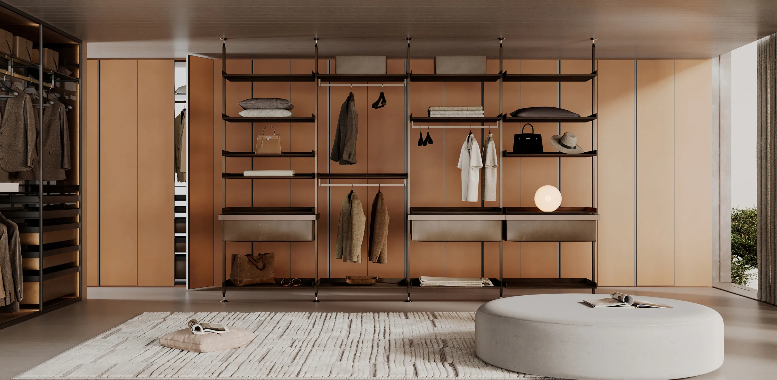 A curated walk-in system defined by modular architecture and refined craftsmanship. Each component is tailored to the exact dimensions of your space, offering infinite possibilities in layout, accessories, and material combinations.