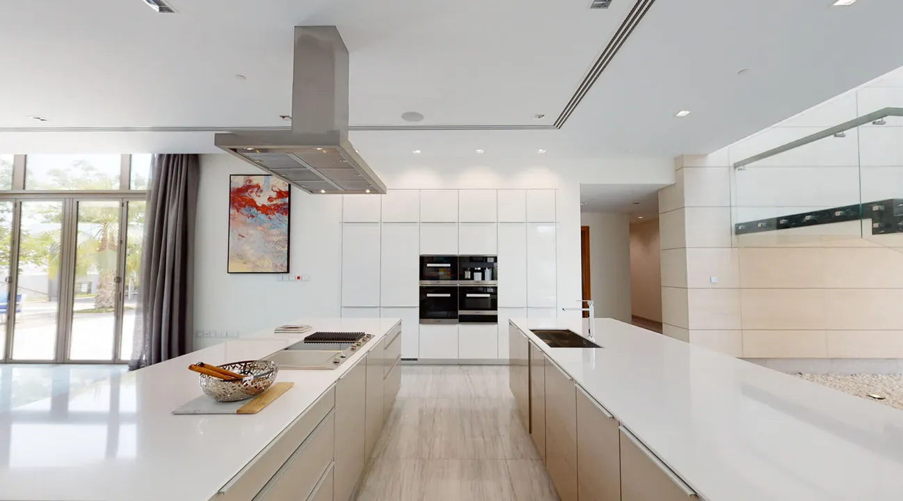 A private villa design showcasing luxury and serene leisure. This villa interior fitout in District One, Dubai features spacious, light-filled rooms, including a fitness studio, swimming pool, kitchen, and dining area, all set within landscaped grounds that create a private sanctuary with luxury living.