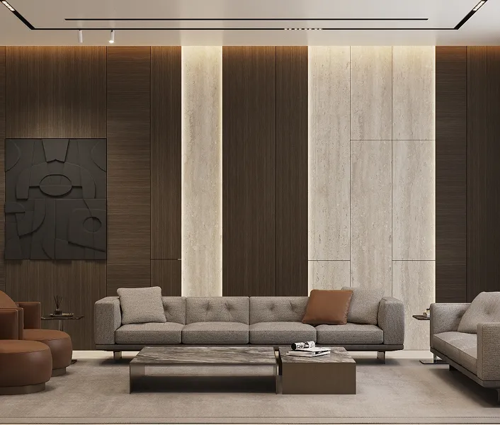 In home interior design in Abu Dhabi, natural wood veneers remain the benchmark of craftsmanship, resembling the warmth of timber in a sustainable form. Walnut and white oak dominate high-end interiors in the UAE for their timeless color tones and stability, while exotic veneers like Macassar ebony, smoked eucalyptus, and Zebrano can serve as statement pieces in distinct areas, such as majlis walls or executive offices.