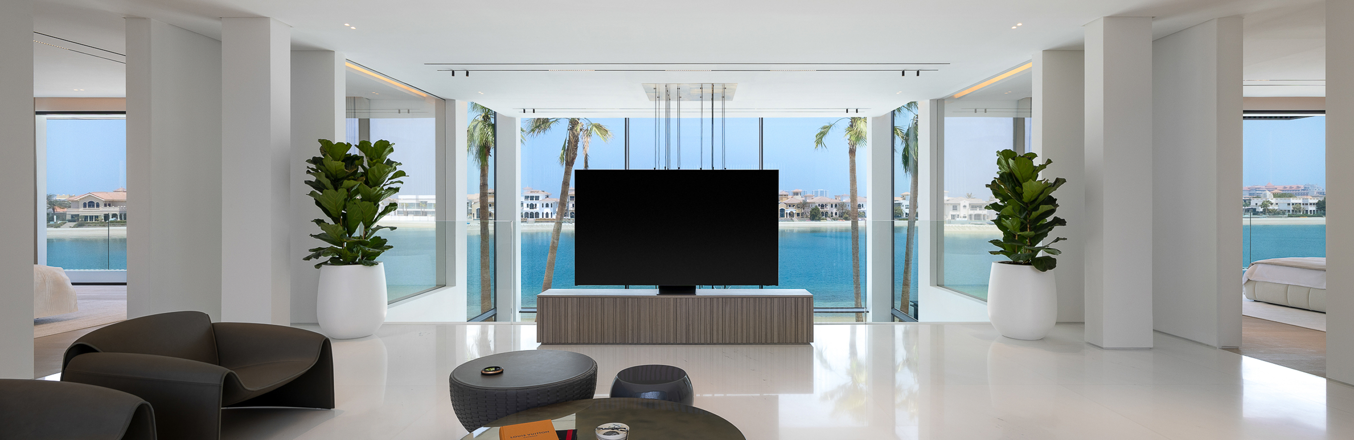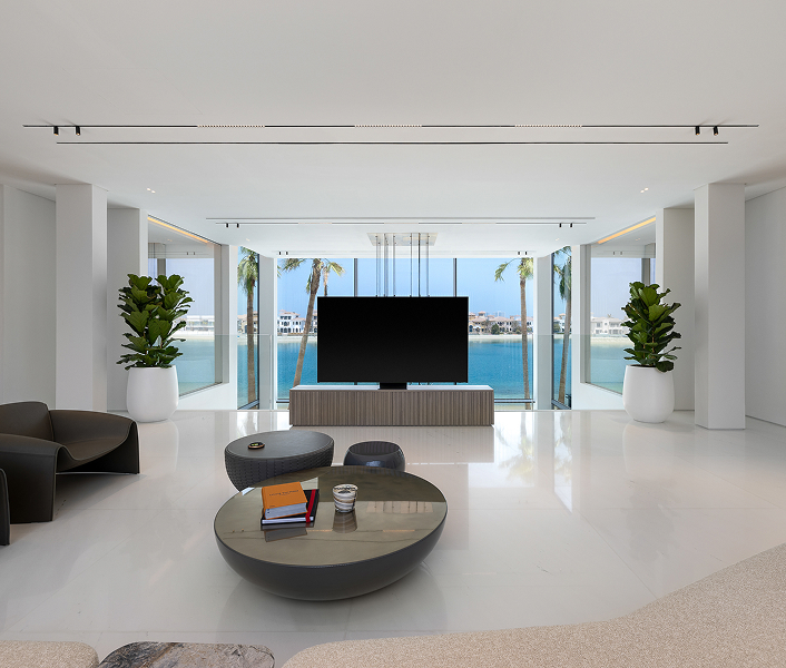 Rayfitout designs double-height ceilings in villas, panoramic glazing in waterfront apartments, structural columns in towers, and slab depths typical of high-rise construction. Furniture layouts, ceiling features, and joinery lines are aligned with these architectural conditions to maintain proportion and clarity. Our team positions lighting, media walls, and custom elements to highlight views, daylight patterns, and circulation in Dubai residences.