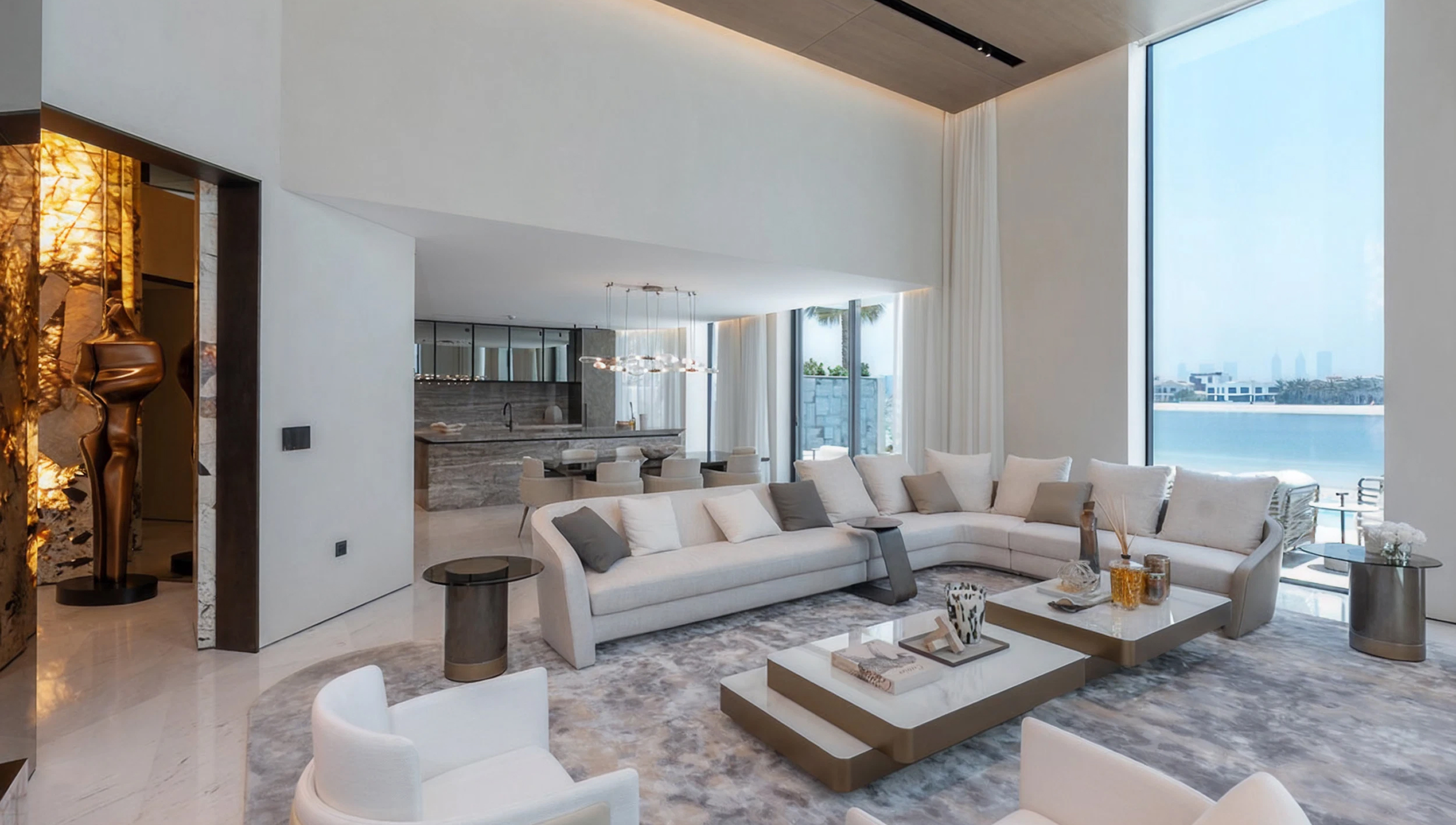 Luxury living room interior design in Dubai includes custom furniture layouts, premium materials, wall and ceiling treatments, lighting strategies, and turnkey execution for villas, apartments, and penthouses.
