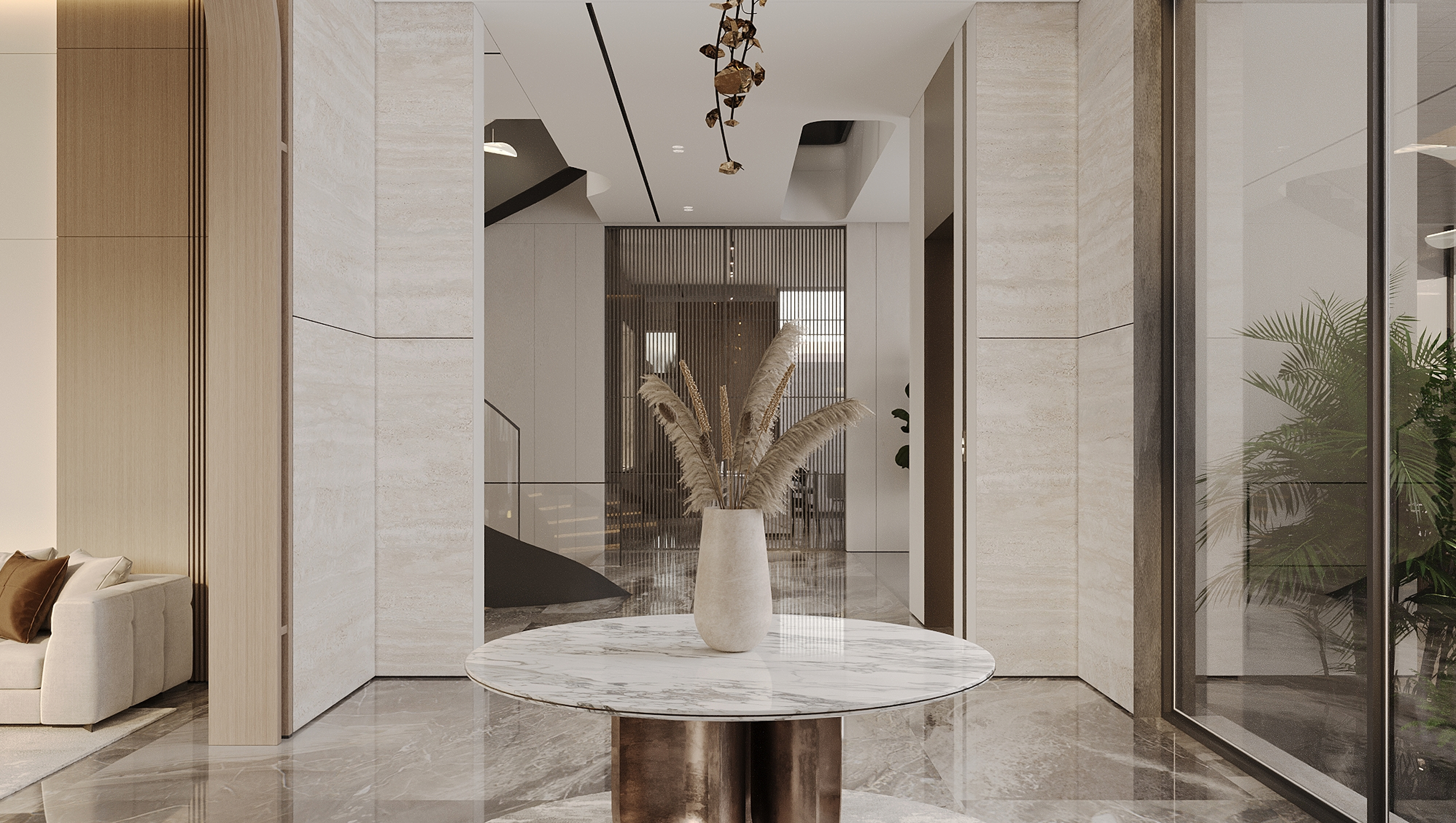 Light is a material in and of itself. Before beginning any project, Rayfitout studies how light behaves, how it enters, shifts, reflects, and defines space. Light is not just about illumination; it guides and shifts the atmosphere of the interior architecture. One example is our innovative mesh sliding door system, designed to filter natural light and cast soft, dynamic shadows throughout the space.lla interior design companies in Dubai, selects finishes for villa interior design by their timeless quality, how they age, how they endure, and how they evolve. With over 30 years of experience designing villas across the UAE, we understand that the true value of a material lies in its ability to age gracefully, revealing its depth and character over time. Similarly, light interaction is equally important. The surface must be evaluated based on how it responds to both natural and artificial light: how it casts shadows, catches reflections, and reveals its detail at specific angles. With marble, for instance, it’s about how the veins match and glide across a wall, how it flows in continuity, and how it comes alive as light moves through space. It’s through the revelation of these subtle details that result in truly exclusive and custom villa interiors.